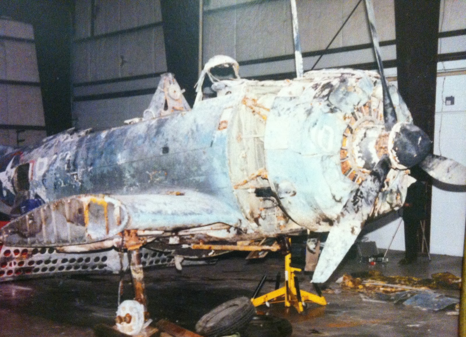 During WWII the Navy conducted carrier landing training on the USS Wolverine. Training was conducted on Lake Michigan off shore from Great Lakes Naval Training station. During more than one landing errors occurred and aircraft were lost over the side and into the depths of Lake Michigan. Several years ago one of the lost aircraft, an SBD-3 Dautless, was recovered from the bottom of the lake. Here's a picture of the wreck post recovery.